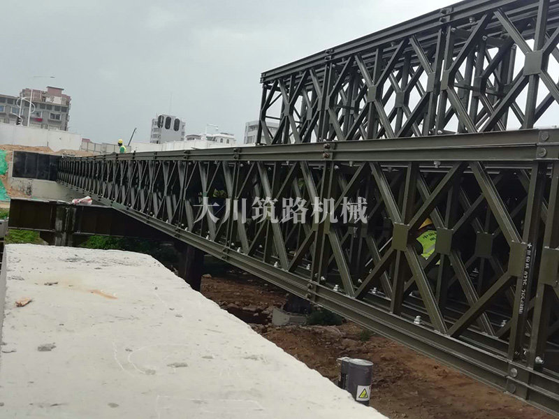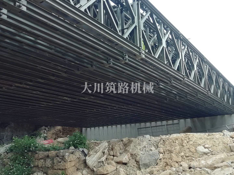 鋼橋型號(hào):48m*16m加強(qiáng)型6(車道)+2(人行通道)+防撞護(hù)欄,上承式鋼橋,橫向布置35排貝雷梁,分兩跨,橋墩為單排四柱式φ800鋼管樁,上表鋪混泥土。